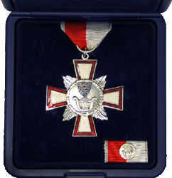 | Silber: | für 25jährige aktive Tätigkeit oder hervorragende Verdienste, weiß/rotes Band mit silbernen Webkanten | |