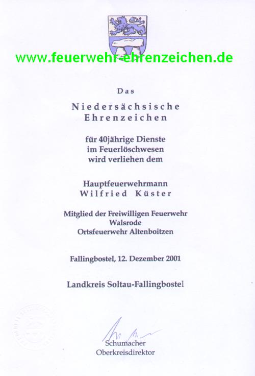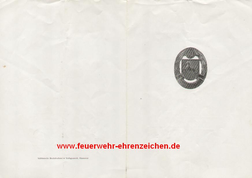 | Quellen: | Beschluß des Niedersächsischen Landesministeriums über die Verleihung von Ehrenzeichen für Verdienste im Feuerlöschwesen vom 8.4.1954/25.1.1955 (NdsMBl. 1955 S. 110) RdErl. vom 17.7.1975 (Nds.MBl. S.1107) RdErl. vom 14.9.1977 (Nds.MBl. S.1278) RdErl. vom 26.11.2004 (Nds.MBl. Nr.1/2005 S.3) |