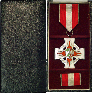 | Unterstufen: | Silber: | am rot/weiß/roten Band mit silbernen Webkanten, für mindestens 25jährige aktive und pflichttreue Dienstleistung in einer Feuerwehr |