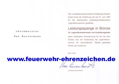 Durch den Vorstand des Landesfeuerwehrverbandes am 21. Juni 1963 gestiftet. 1966 wurde die Verleihung nach der Schaffung der Leistungsspange des Deutschen Feuerwehrverbandes 30004 eingestellt. Durch einen erneuten Vorstandsbeschluss vom 19. November 1980 wurde die Bronzestufe wieder verliehen, diesmal an Kommunalpolitiker für Verdienste um den Aufbau der Jugendfeuerwehr. Die Verleihungen waren an Quoten gebunden, pro Kreis- bzw. Stadtfeuerwehrverband konnten jährlich verliehen werden: 2x Bronze pro angefangene 20 Jugendfeuerwehren, 2x Silber pro angefangene 25 Jugendfeuerwehren und 1x Gold pro angefangene 30 Jugendfeuerwehren. |