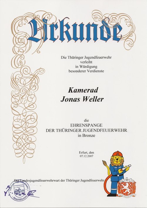 | Quellen: | Ehrungsordnung der Thüringer Jugendfeuerwehr für die Ehrenspange, Stand 2012 Richtlinie zu § 5 / 3 der Ehrungsordnung der Thüringer Jugendfeuerwehr |