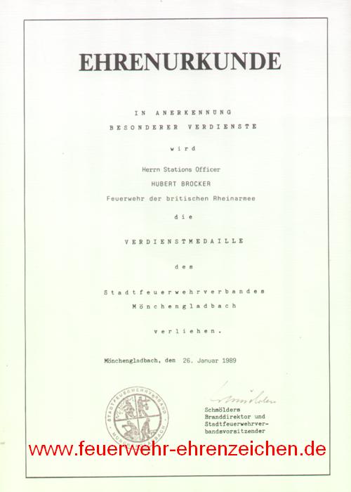 | Quellen: | Richtlinie über die Ehrung von Feuerwehrmännern/-frauen und verdienter Persönlichkeiten durch den Stadtfeuerwehrverband Mönchengladbach e.V. vom 01. Januar 2002 |